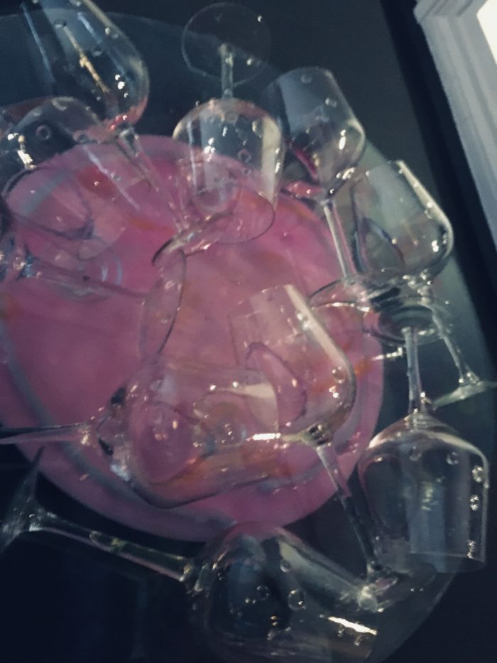Des verres à vin sont saisis et chemisés dans un plateau de résine epoxy coloré bleu/rose/jaune transparent. Plateau fixé par des visses à un plus petit plateau en résine rose, incrusté d’un ruban LED.