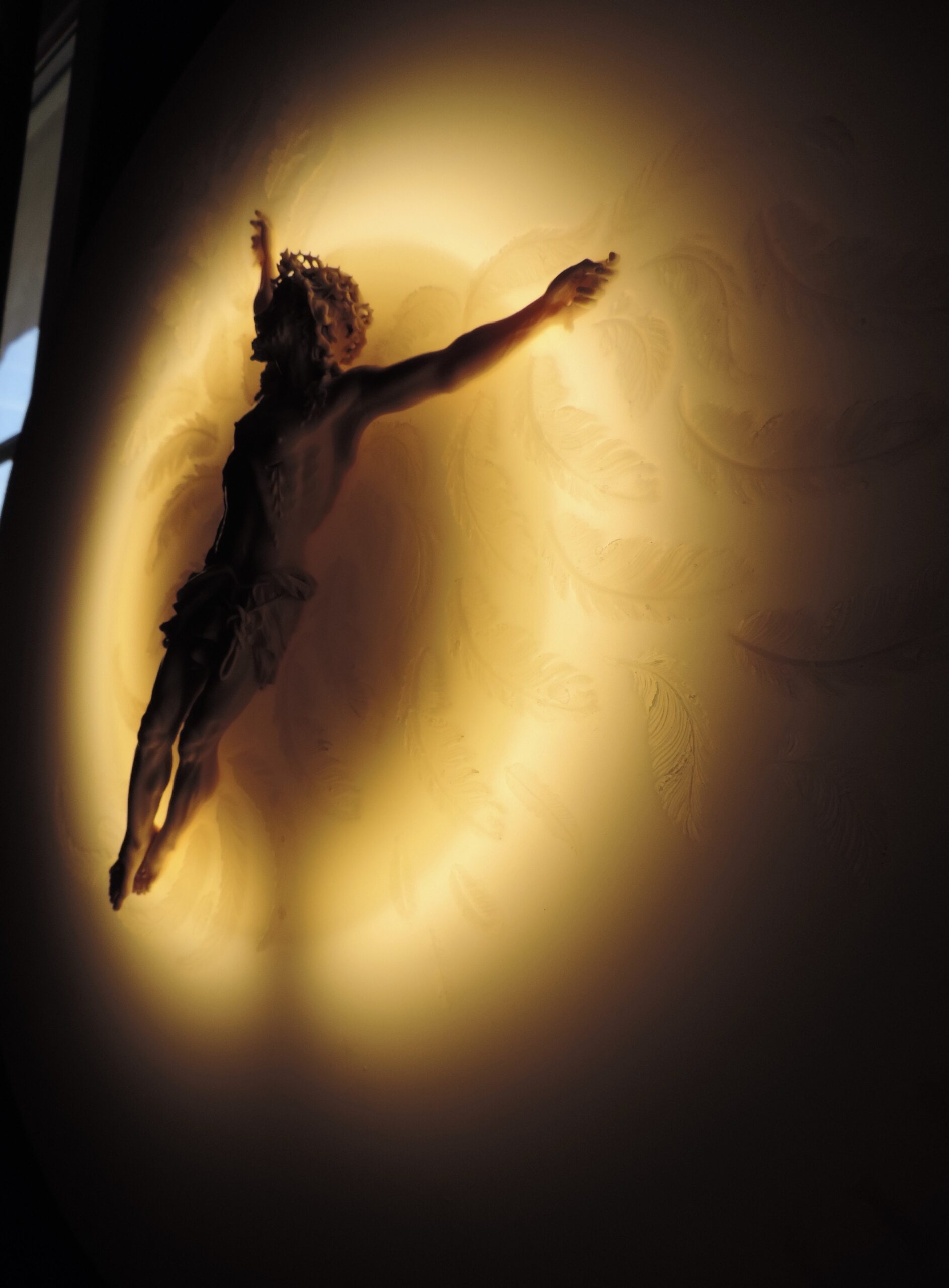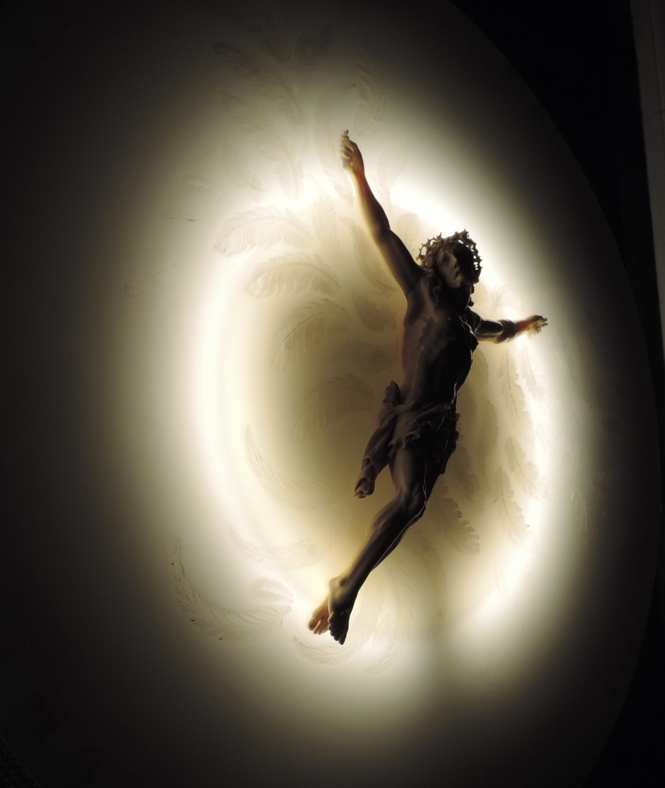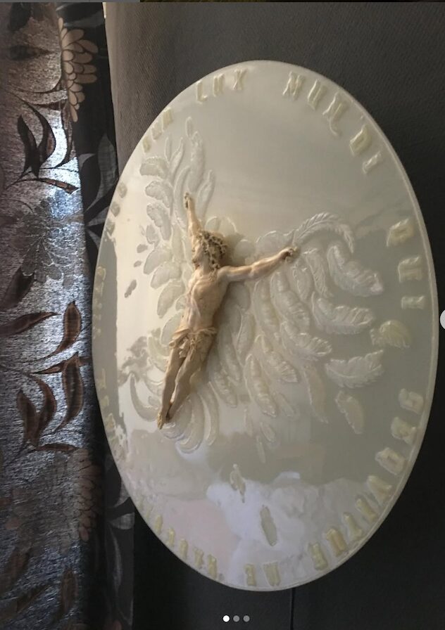 Dans un plateau de résine est incrusté un Christ en ivoire du XVIIè sc : CORPUS CHRISTI Art Contemporain et Design. Ce plateau (diamètre 60) est incrusté un ruban LED que l’on peut allumer grâce à un détecteur de mouvement.